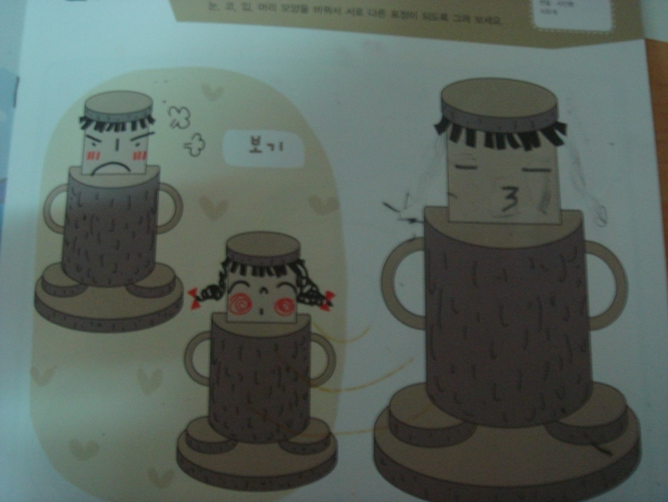 3. ´«¾Ë, »öÁ¾ÀÌ µîÀ» ÀÌ¿ëÇÏ¿© ÀÎÇüÀ» ±¸Ã¼ÈÇÑ´Ù. 4. ¾ó±¼À» ºÙÀÌ°í ¹Þħ´ë¿¡ °íÁ¤½ÃŲ´Ù.