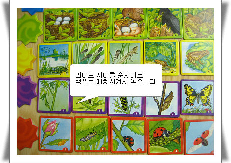 ![]() ![]() °ÔÀÓÀÇ ·ê ÀÚü´Â ³Ê¹«µµ °£´ÜÇÑ °ÔÀÓÀÌÁö¸¸ ³Ê¹« ¾î¸° ¿¬·É´ë°¡ Çϱ⿡´Â Á¶±Ý ¾î·Á¿ï¼ö°¡ ÀÖ½À´Ï´Ù. ÀÌ °ÔÀÓÀº 6¼¼ ÀÌ»óÀÇ ¿¬·ÉÀÇ ¾ÆÀ̵éÀÇ µ¿¹°µéÀÇ ¶óÀÌÇÁ »çÀÌŬµµ ¾Ë°Ô µÇ°í »ö±ò°ú µ¿¹°À» ¸ÅÄ¡¸¦ ½ÃŰ¸é¼ ÇÒ¼ö ÀÖ´Â °ÔÀÓÀ̶ó°í ÇÒ¼ö°¡ ÀÖ½À´Ï´Ù. ![]() ![]() ÃÑ 7°³ÀÇ º°¸ð¾çÀÇ »ö±ò Ä«µå 35°³ÀÇ µ¿¹°ÀÇ life cycle cards·Î ±¸¼ºÀÌ µÇ¾îÀÖ½À´Ï´Ù. =>ÇѰ³ÀÇ º°¿¡ ÇØ´çÇÏ´Â »ö±òÀ» ¸ÅÄ¡½ÃÄѼ ÃÑ 5°³ÀÇ µ¿¹°ÀÇ life cycleÄ«µå¸¦ ¼ø¼´ë·Î ´Ã¾î³õ´Â °ÔÀÓÀÔ´Ï´Ù. ![]() ![]() ÃÑ 7°³ÀÇ µ¿¹°µéÀÌ ³ª¿À´Âµ¥ °¢°¢ÀÇ µ¿¹°µéÀº Life cycle¼ø¼´ë·Î Ä«µåÀÇ ÇÏ´Ü ºÎºÐ¿¡ ÀÌ·¸°Ô ¼ýÀÚ°¡ ÀûÇôÀÖ½À´Ï´Ù. °³±¸¸®³ª ¹«´ç¹ú·¹ÀÇ °æ¿ì´Â ±×·¸°Ô Çò°¥¸®´Â ºÎºÐÀÌ ¾øÁö¸¸ µ¶ÀÏ ¼¼ÆÛµåÀÇ °æ¿ì¿¡´Â Á» ¾Ö¸ÅÇÑ ºÎºÐÀÌ Àִµ¥ ÀÌ Ä«µå¿¡ ÀûÇôÀÖ´Â ¼ýÀÚ¸¦ È®ÀÎÇÏ¸é¼ °ÔÀÓÀ» ÇÏ½Ã¸é µÈ´ä´Ï´Ù. ![]() ÀÚ¼¼È÷ º¸½Ã¸é º°¸ð¾çÀÇ Ä«µå¿Í °¢°¢ µ¿¹°µéÀÇ Å׵θ®ÀÇ »ö±òÀÌ ÀÏÄ¡¸¦ ÇÕ´Ï´Ù. ¸Â´Â »ö±òÀÇ ½ºÆ¼Ä¿¿·À¸·Î Ä«µå¸¦ ³õÀ¸¸é¼ °æ±â¸¦ ÁøÇàÇÏ¸é µÈ´ä´Ï´Ù. *°ÔÀÓ¸ñÇ¥ °¡Àå ¸¹Àº º°À» ¸ðÀ¸´Â ¼±¼ö°¡ °æ±â¿¡¼ À̱â´Â °ÔÀÓÀÔ´Ï´Ù. How to play °¡Àå ¾î¸° ¼±¼öºÎÅÍ ½ÃÀÛÀ» Çϴµ¥ ½Ã°è¹æÇâÀ¸·Î °æ±â¸¦ ÁøÇàÇÕ´Ï´Ù. ´Ù¸¥ »ç¶÷µéÀÌ º¼¼ö ÀÖµµ·Ï µÚÁý¾îÁø ±×¸²Ä«µå¸¦ ÇÑÀå ²¨³»¼ º¸¿©ÁÝ´Ï´Ù. ¸¸ÀÏ »ý¹°Ã¼ÀÇ ¹øÈ£°¡ 1ÀÎ °æ¿ì¿¡´Â ÇØ´çÇÏ´Â »ö±òÀÇ º° ¿·¿¡ ±×¸²Ä«µå¸¦ ³õ°í ¶Ç´Ù¸¥ Ä«µå¸¦ »ÌÀ»¼ö°¡ ÀÖ½À´Ï´Ù. ¸ÕÀú »Ì¾Ò´ø »ý¹°Ã¼¿Í °°Àº »ý¹°Ã¼ÀÇ ¹øÈ£°¡ 2ÀΰÍÀ» »Ì°Ô µÇ¸é 1¹ø ¿·¿¡ ³õ°í °è¼Ó Ä«µå¸¦ »ÌÀ»¼ö°¡ ÀÖ½À´Ï´Ù. ´Ù¸¥ »ý¸íü 1¹øÀ» »ÌÁö ¸øÇ߰ųª °è¼Ó life cycleÀÇ ¼ø¼¿¡ ¸ÂÁö ¾ÊÀ»¶§´Â ´Ù¸¥ ¼±¼öÀÇ Â÷·Ê·Î ³Ñ¾î°©´Ï´Ù. »Ì¾Ò´ø Ä«µå°¡ ¸ÅÄ¡°¡ ¾ÈµÉ °æ¿ì ´Ù½Ã µÚÁý¾î ³õ½À´Ï´Ù. ÀÚ½ÅÀÌ »Ì¾Ò´ø Ä«µå¸¦ ±â¾ïÇØµÎ¸é ´ÙÀ½¹ø¿¡ »ÌÀ»¶§ µµ¿òÀÌ µÈ´ä´Ï´Ù. °æ±âÁ¾·á 1¹øºÎÅÍ 5¹ø±îÁö ¸ÕÀú ¸ÅÄ¡¸¦ ½ÃŲ ¼±¼ö°¡ º°À» °¡Á®°¡°Ô µË´Ï´Ù. 7Á¾·ùÀÇ »ý¸íü¸¦ ¼ø¼´ë·Î ¸ðµÎ ¸ÅÄ¡½ÃŰ¸é °ÔÀÓÀÌ Á¾·á°¡ µÇ°í °¡Àå ¸¹Àº º°À» ¾òÀº »ç¶÷ÀÌ ¿ì½ÂÀ» ÇÏ°Ô µÈ´ä´Ï´Ù. ¸¸ÀÏ °¡Áø º°ÀÇ °¹¼ö°¡ °°´Ù¸é °øµ¿¿ì½ÂÀÌ µË´Ï´Ù. ![]() 1.°ÔÀÓ·êÀÌ °£´ÜÇÏ¿© ³²³à³ë¼Ò ´©±¸³ª Áñ±æ¼ö ÀÖ´Â °ÔÀÓÀÔ´Ï´Ù. 2.°ÔÀÓÀ» ÅëÇØ¼ µ¿¹°ÀÇ Life cycleÀ» ¾Ë¾Æ°¥¼ö°¡ ÀÖ½À´Ï´Ù. 3.°ÔÀÓÀ» Çϸ鼵µ µ¿¹°¿¡ °üÇÑ ¿©·¯°¡Áö »ó½ÄÀ» ¹è¿ï¼ö°¡ ÀÖ½À´Ï´Ù.(ºÎ¸ð´ÔÀÌ ¹Ì¸® °øºÎ¸¦ ÇØ¿À½Ã¸é °ÔÀÓÀ» ÇÏ¸é¼ Áö½ÄÀ» ¾òÀ»¼ö°¡ ÀÖ½À´Ï´Ù. 4.¸¹Àº º°À» ȹµæÇϱâ À§Çؼ Çѹø µÚÁý¾ú´ø Ä«µå¸¦ ±â¾ïÇØ¾ß ÇϹǷΠÁýÁß·Â Çâ»ó¿¡ µµ¿òÀÌ µË´Ï´Ù. 5.¼ö·®À» Àû°Ô Á¶Á¤Çؼ ¸Þ¸ð¸®°ÔÀÓÀ¸·Î Ȱ¿ëÇÒ¼ö°¡ ÀÖ½À´Ï´Ù. ![]()
