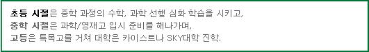 | ¼¼»ó¿£ ¿©·¯ °¡Áö Ư¼ºÀÇ ¾ÆÀ̵éÀÌ ÀÖ°í ¿©·¯ °¡Áö Á¶°ÇÀÇ ºÎ¸ðµéÀÌ ÀÖ´Ù. ¾ÆÀÌµé ±âÁØÀ¸·Î º¸ÀÚ¸é ±× Áø·Î, ÁøÇÐÀ» °áÁ¤ÇÏ´Â ÁÖ ¿äÀÎÀ¸·Î´Â Å©°Ô µÎ °¡Áö¸¦ ²ÅÀ» ¼ö ÀÖÀ» °Í °°´Ù. Çϳª´Â ¼öÇÐÀ̳ª ¾ð¾î¿¡ °üÇÑ Àû¼ºÀ» ±âÁØÀ¸·Î ¹®°úÇü, À̰úÇüÀ» ±¸ºÐÇÏ´Â °ÍÀÌ°í ¶Ç Çϳª´Â °øºÎ¿¡ ´ëÇÑ ¼º½Ç¼º, âÀǼºÀÇ °íÀú ¼öÁØÀ» °¡Áö°í ÆÇ´ÜÇÏ´Â °ÍÀÌ´Ù. ´õºÒ¾î ºÎ¸ðÀÇ °æÁ¦Àû ¼öÁصµ Áø·Î °áÁ¤¿¡ ¹«½Ã¸ø ÇÒ Áß¿äÇÑ °áÁ¤ ¿äÀÎÀÌ µÉ ¼ö ÀÖ´Ù. ¶ÇÇÑ ¼¼»ó¿¡´Â º¸Æí¼º ¿©ºÎ¸¦ ¶°³ª ´ÙÀ½°ú °°ÀÌ ¿©·¯ °¡Áö À¯ÇüÀÇ °í·ÁÇÒ ¸¸ÇÑ Çб³µéÀÌ ÀÖ´Ù. 1) Ãʵî: °ø¸³, »ç¸³, À¯ÇÐ, Ȩ½ºÄ𸵠2) Áßµî: ÀϹÝ, ±¹Á¦Áß, ¿Ü±¹ÀÎÇб³, À¯ÇÐ, ´ë¾ÈÇб³ 3) °íµî: ÀϹÝ. Ư¸ñ°í, ¿Ü±¹ÀÎÇб³, À¯ÇÐ, °ËÁ¤°í½Ã 4) ´ëÇÐ: ÀϹÝ, SKY´ëÇÐ, ¹Ì±¹ IVY´ëÇÐ, ¹Ì±¹ Äø®Áö ¾ÆÀ̵éÀÇ Æ¯¼º, ¼ºÀå°úÁ¤À̳ª °¡Á¤ ¿©°Ç¿¡ µû¶ó ¿©·¯ °¡Áö °æ·Î¸¦ ¼±ÅÃÇÒ ¼ö ÀÖÀ» ÅÍÀε¥, ¾Æ·¡¿¡ ´ëÇ¥ÀûÀÎ µÎ °¡Áö À¯ÇüÀ» Á¦½ÃÇÑ ÈÄ ³»°¡ ÀÌ·± »óȲÀ̶ó¸é ³ª´Â ÀÌ·± Áø·Î Àü·«À» ¼±ÅÃÇϰڴٴ ¿¹¸¦ µé¾îº¼±î ÇÑ´Ù. |